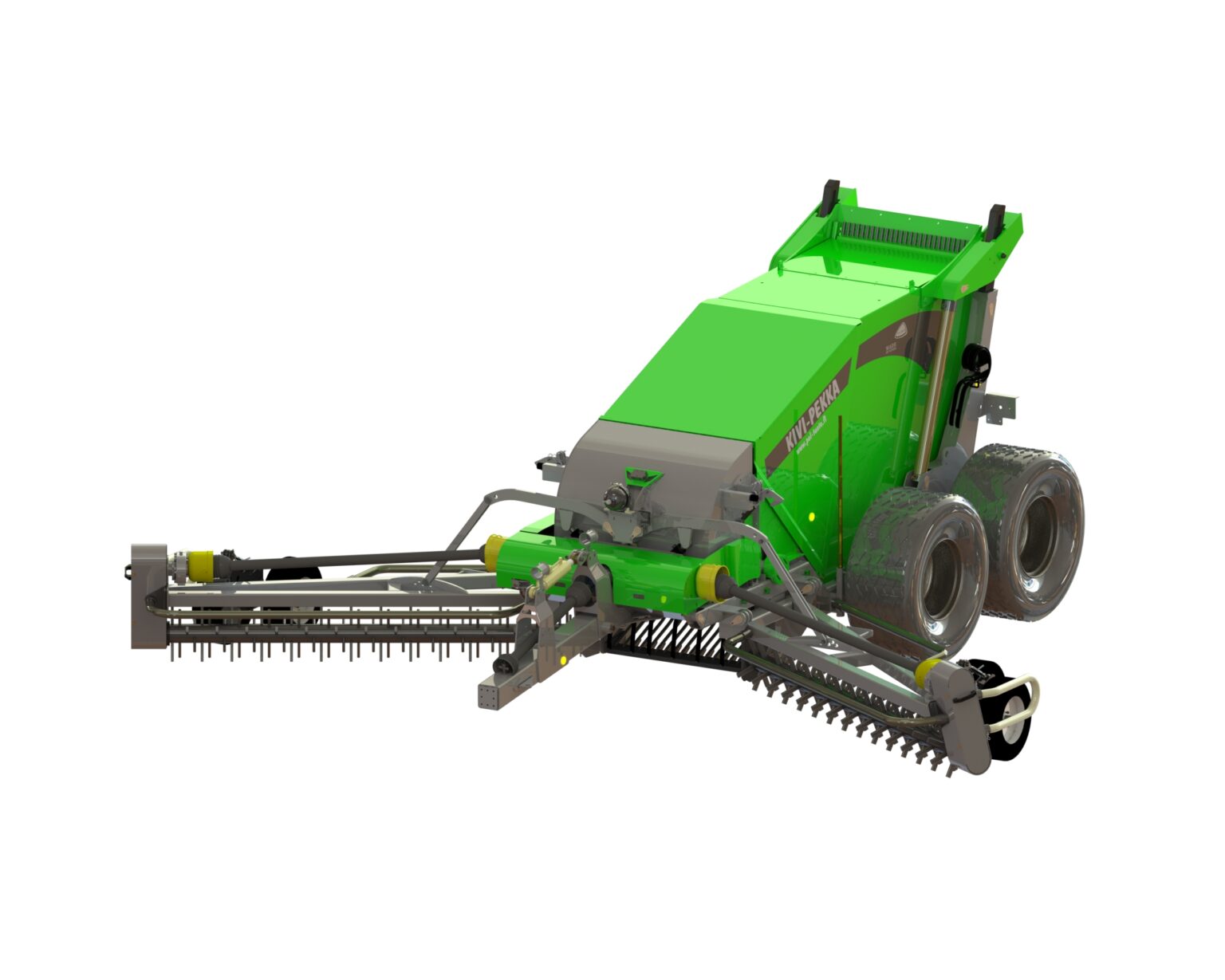 The lifting action is achieved with a hydraulic cylinder, which raises the rakes simultaneously. Mechanical locks secure them into the top position. The operator is able to position the picker in working or transport position from the cab.